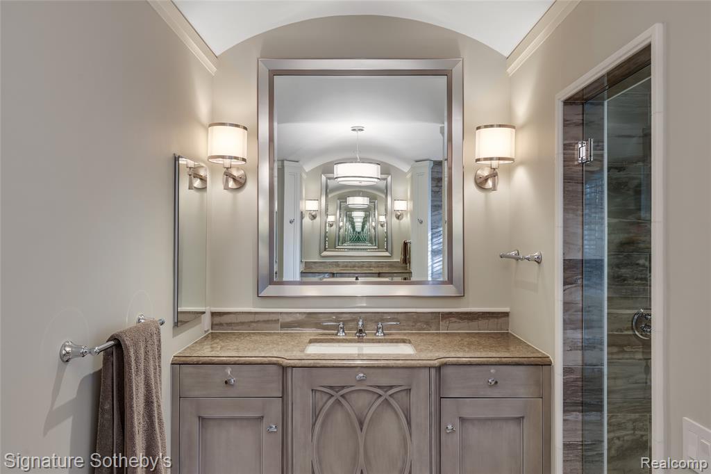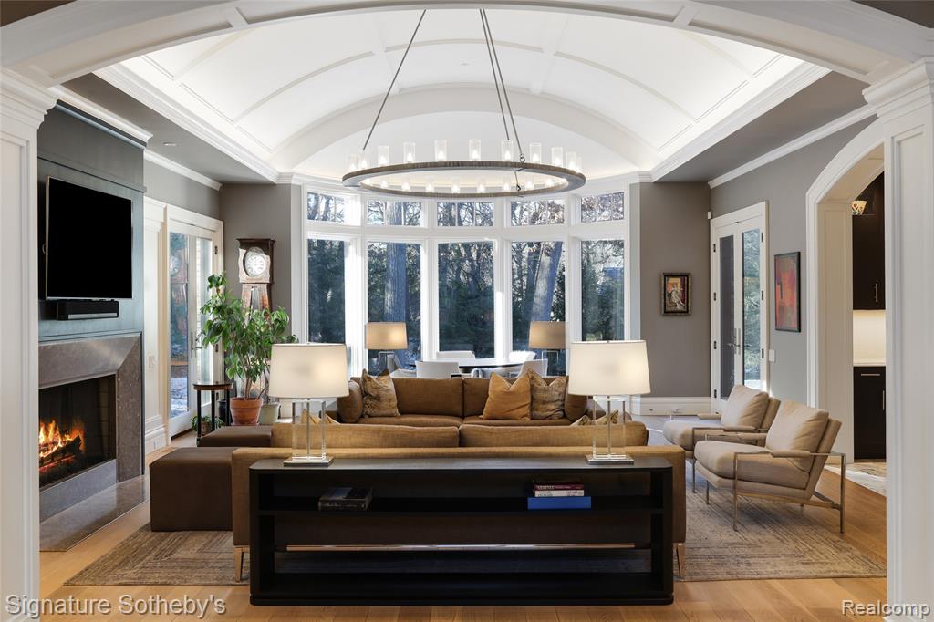 Set on 1.1 acres in a private Bloomfield Hills cul-de-sac, this residence offers 5,919 square feet of refined living with 4 bedrooms and 4.3 bathrooms. Designed by architect Lou DesRosiers and built by Derocher, the home balances timeless form with exceptional function. Italian porcelain flooring introduces the foyer, while intricate moldings and carefully curated finishes elevate every space. A Downsview kitchen anchors the main level, featuring dual islands, Wolf ranges, premium appliances, and a concealed pantry. The layout flows into a light-filled dining nook and living room, where floor-to-ceiling bay windows and a central fireplace establish an elegant focal point. A richly appointed mahogany library, crafted by Vogue Furniture, offers bespoke cabinetry and its own fireplace, while the formal dining room stands ready for elevated entertaining. The main-level primary suite is a retreat unto itself, complete with built-in illuminated closets and a spa-quality bath featuring dual vanities, soaking tub, and walk in shower. Upstairs offers three well-appointed bedroom suites. A dedicated laundry room provides added convenience on the second level. A fully finished lower level provides flexible space for recreation, hosting, or storage. Outdoors, a covered lanai and secluded backyard encourage seamless indoor-outdoor living. The exterior pairs handmade brick with a cedar shake roof, blending texture and timeless character. Additional features include built-in mudroom lockers, heated four-car garage, integrated speaker system, a partial home generator, and much more. A thoughtfully executed residence where craftsmanship and comfort meet with quiet confidence. |